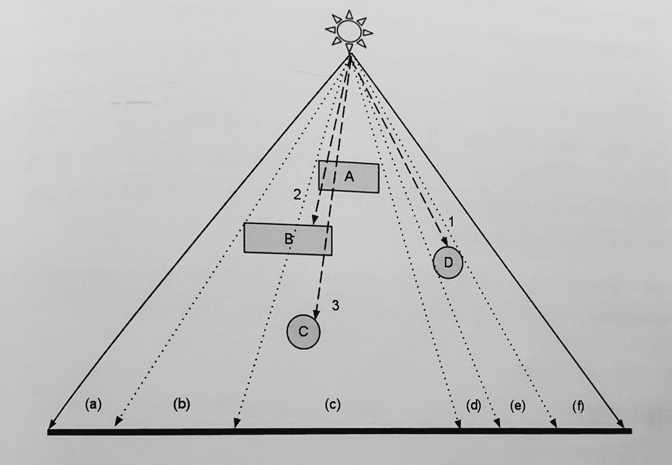 (a), (d), (f)는 가로막는 물체 X, 햇빛 O