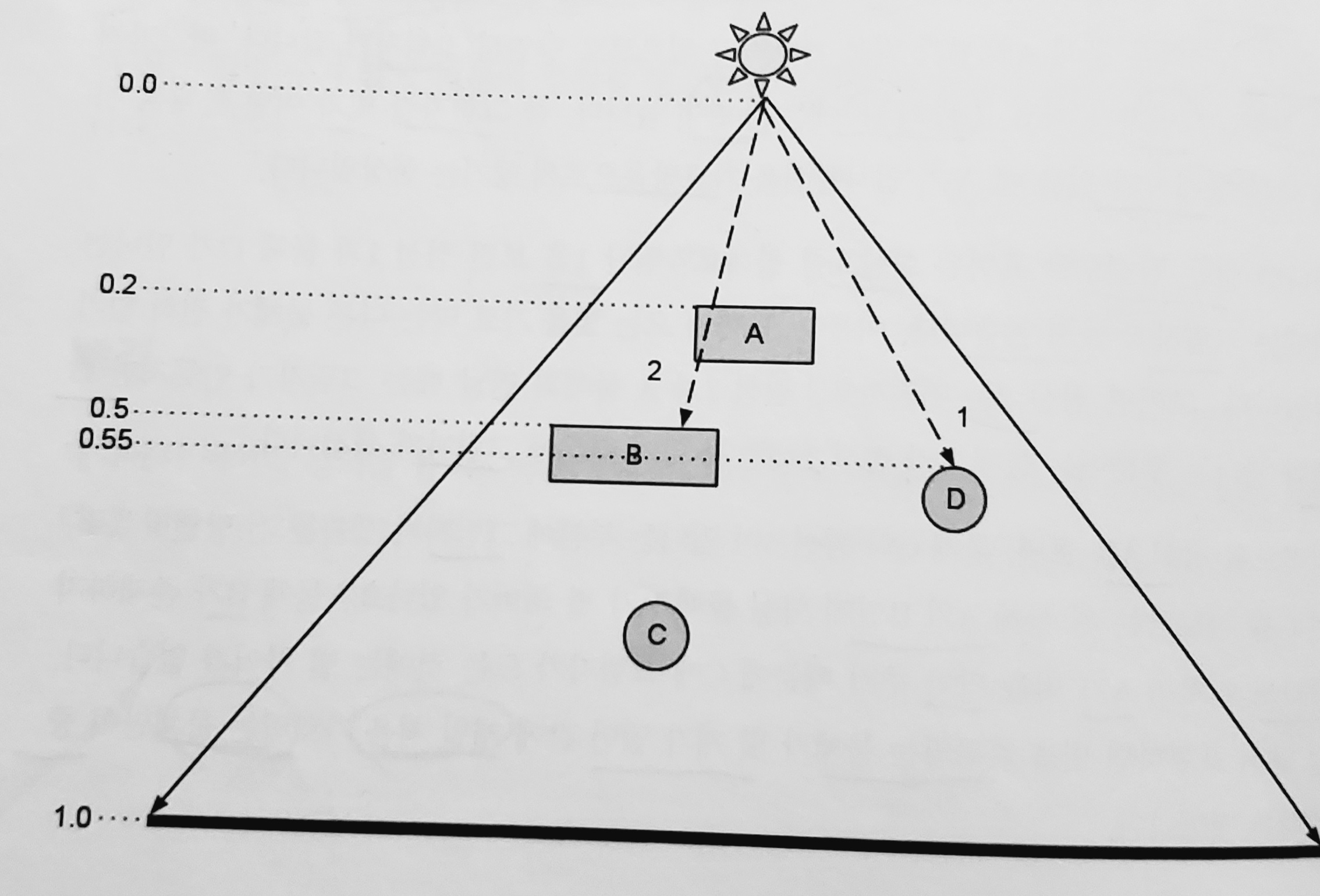 점선 2를 보라. 물체 B와 점선2가 만나는 지점의 픽셀을 생각해보자.