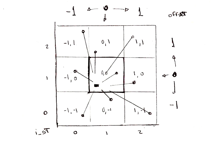 9개의 타일로 구성된 3x3 영역은 이와 같은 이중 for 루프를 사용하여 반복할 수 있다.
