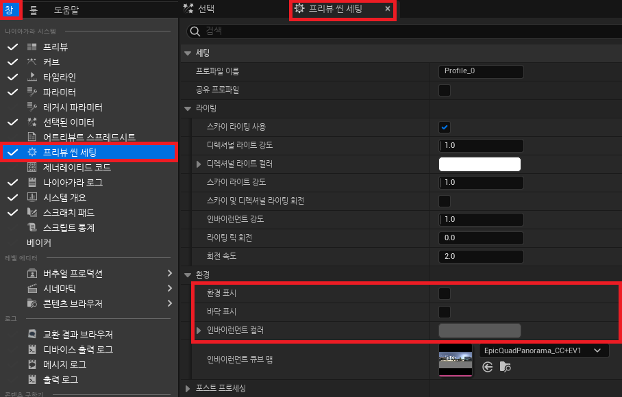 프리뷰 씬 세팅을 아래와 같이 변경한다.
