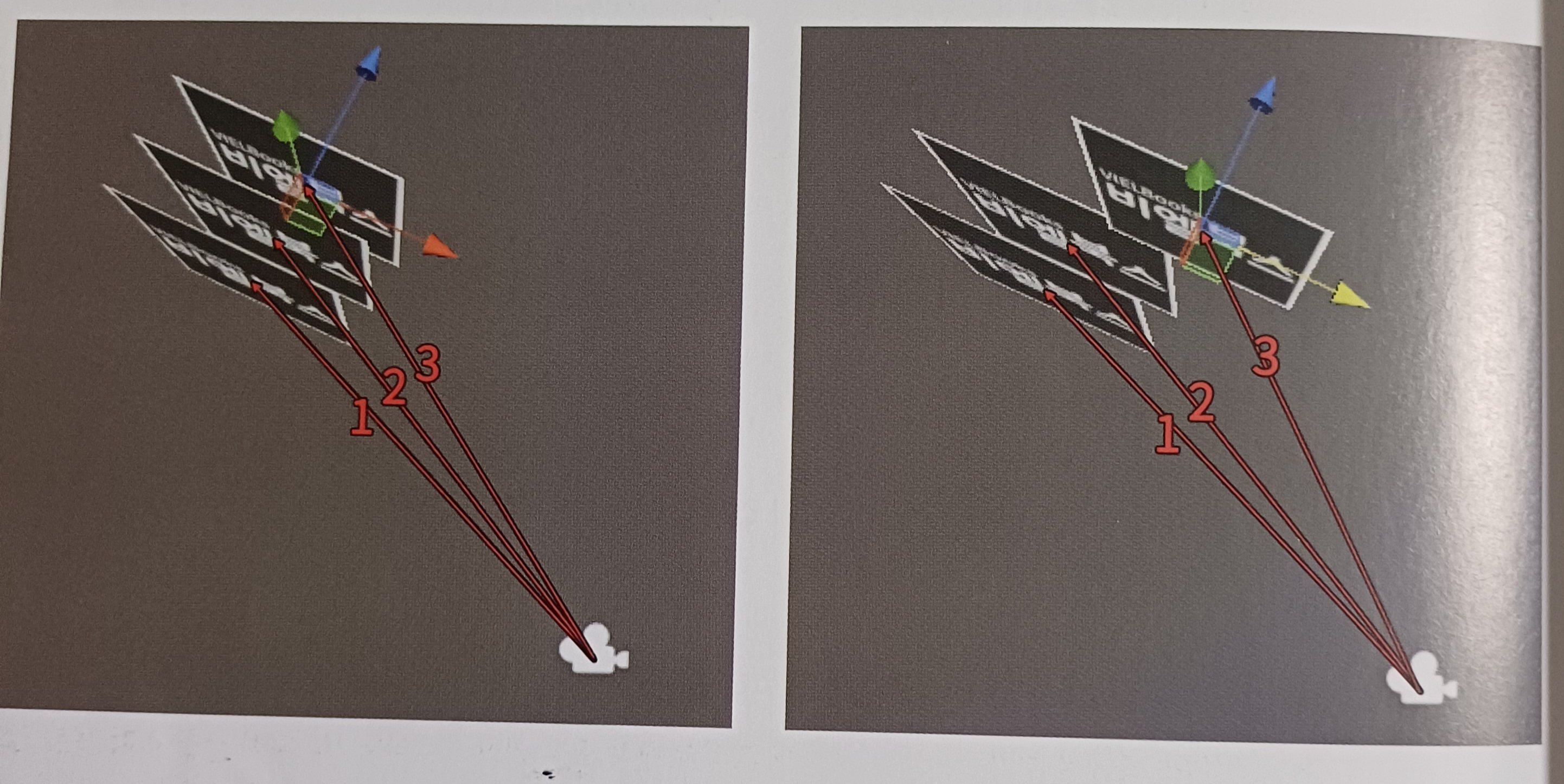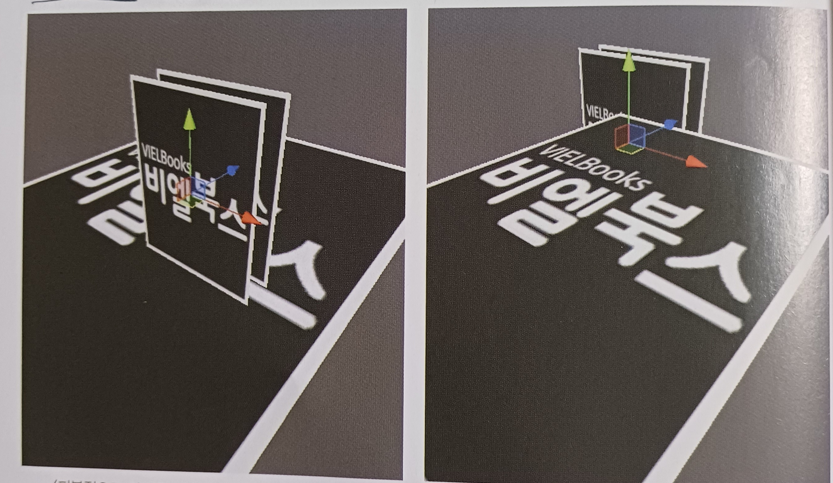 아래 그림에서 우측은 바닥의 피봇이 카메라와 더 가까워서 생긴 문제다.