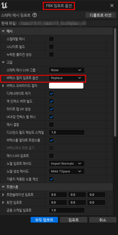 3. 언리얼에서 임포트한다. 임포트 옵션을 필히 확인한다.