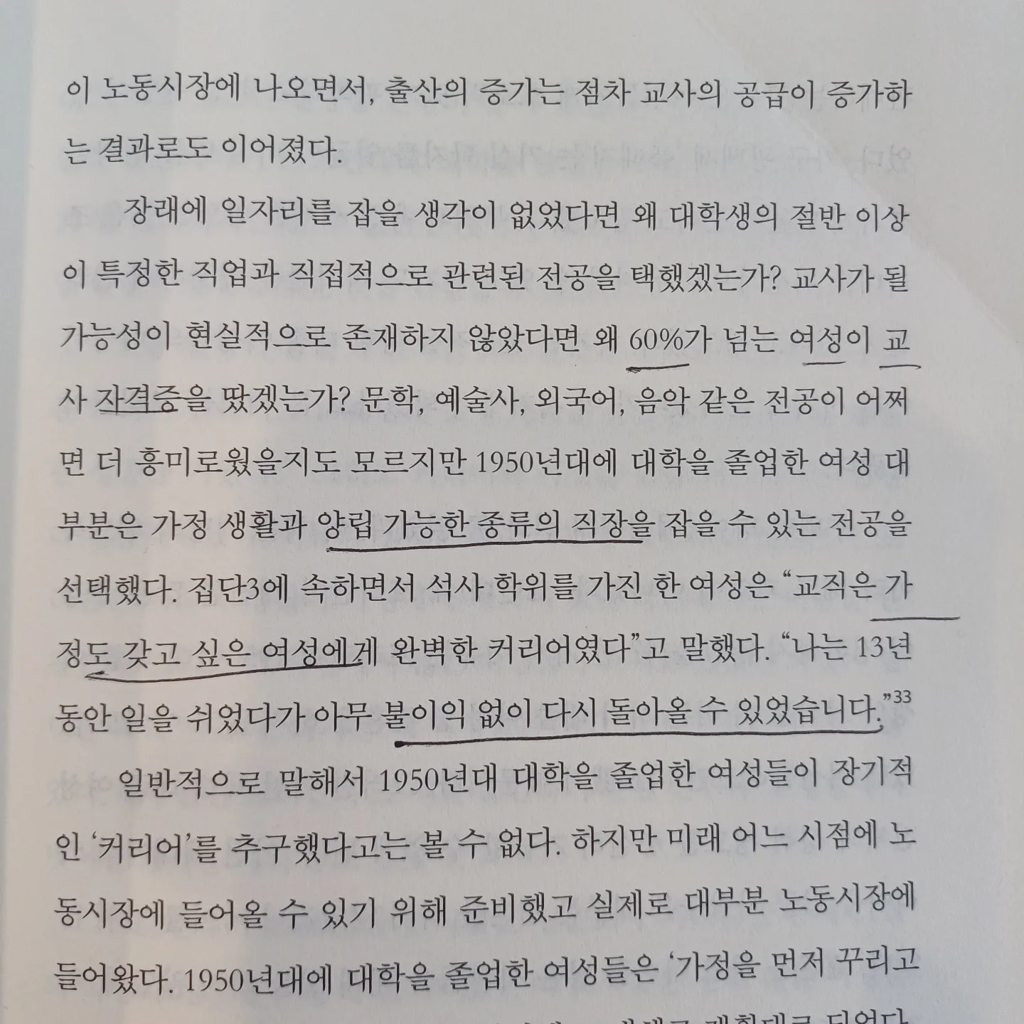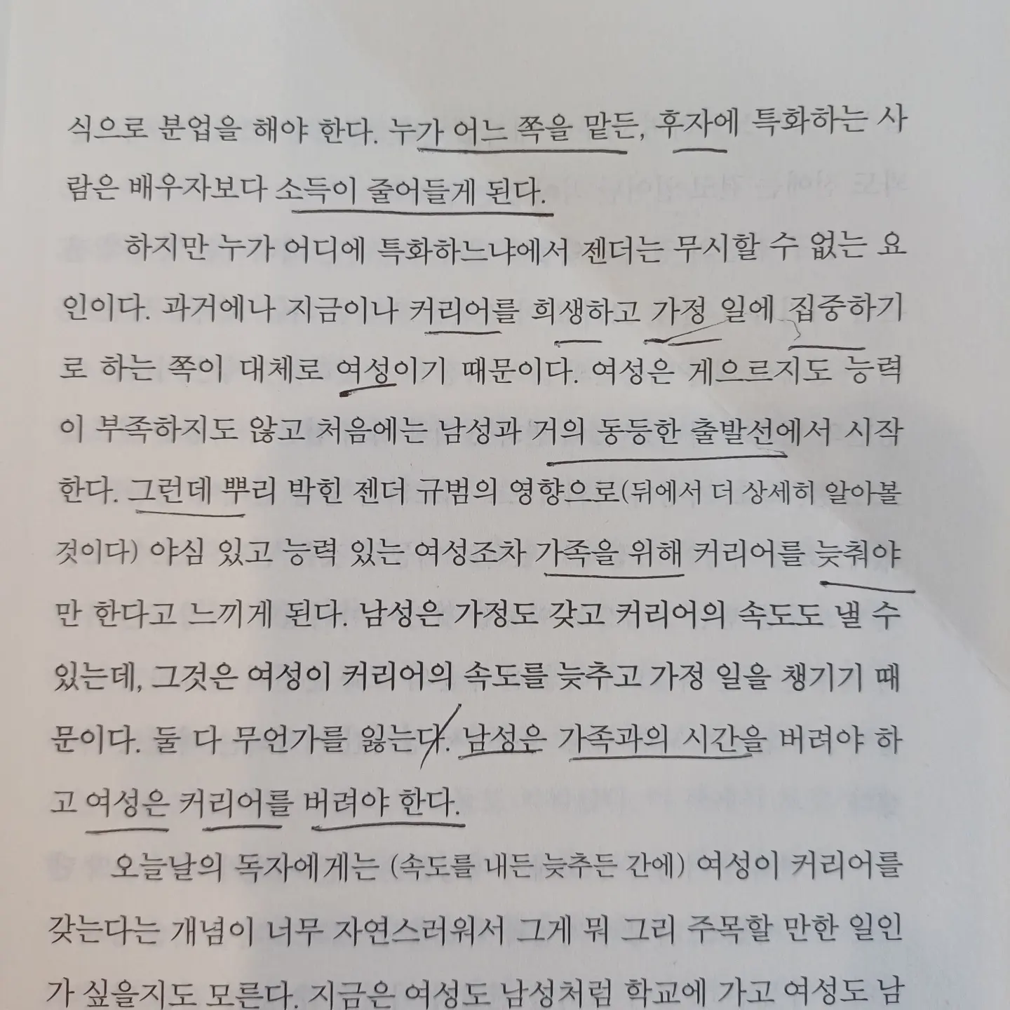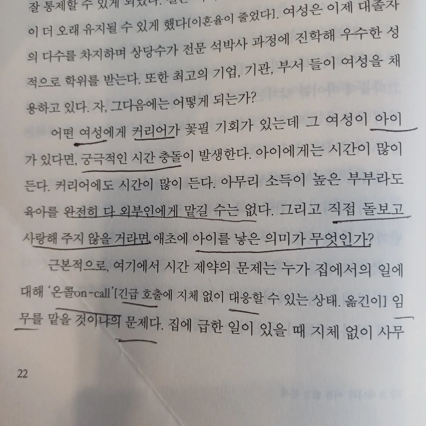 2023 노벨경제학상 수상자가 쓴 책으로, 근거를 토대로 육아부담이 커리어에 미치는 영향을 잘 설명한다. 미처 생각 못한 관점인 '온콜' 문제와 나이에 따른 출산 문제를 짚어주어 좋았다.