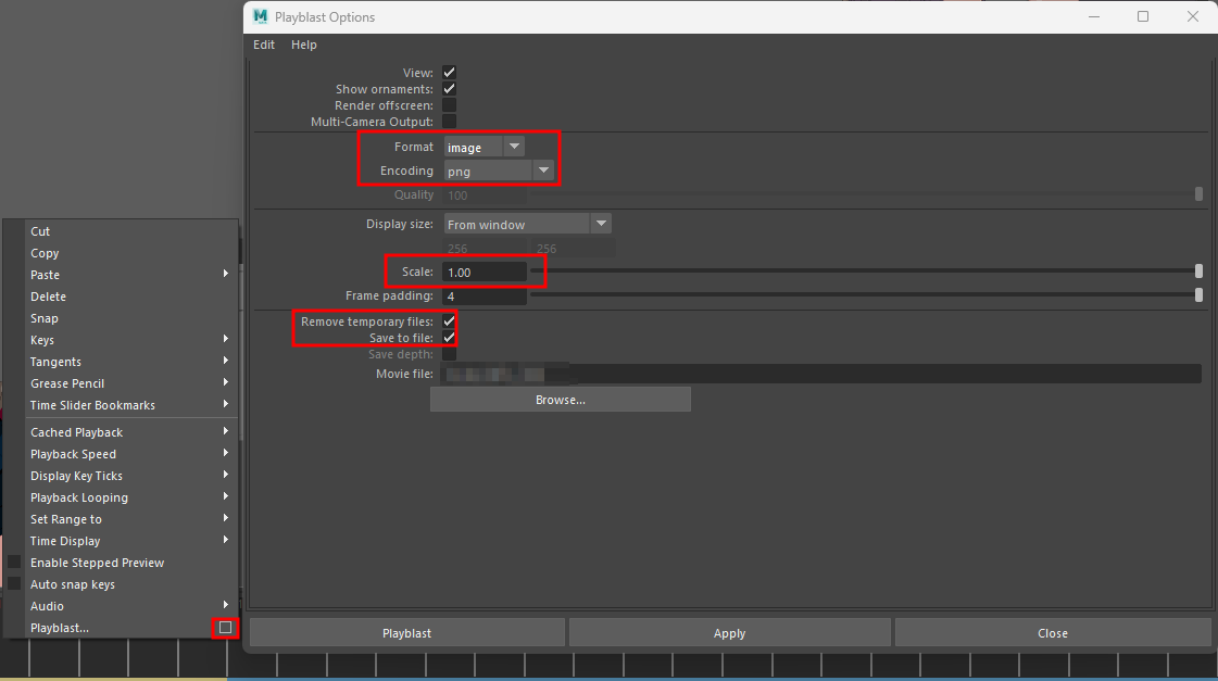 1.타임라인 우클릭 - playblast를 아래 옵션과 같이 설정하여 뽑는다.