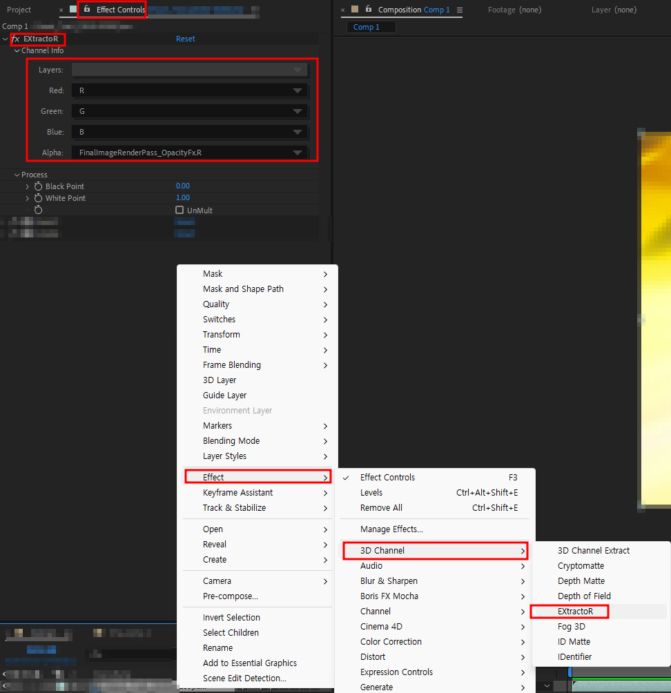 1. 타임라인 패널에서 레이어 우클릭 후, 아래와 같이 EXtractoR을 적용한다.
