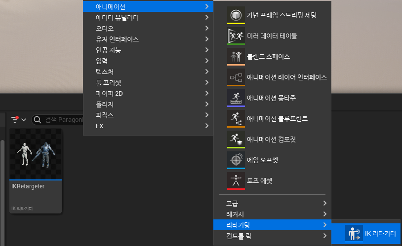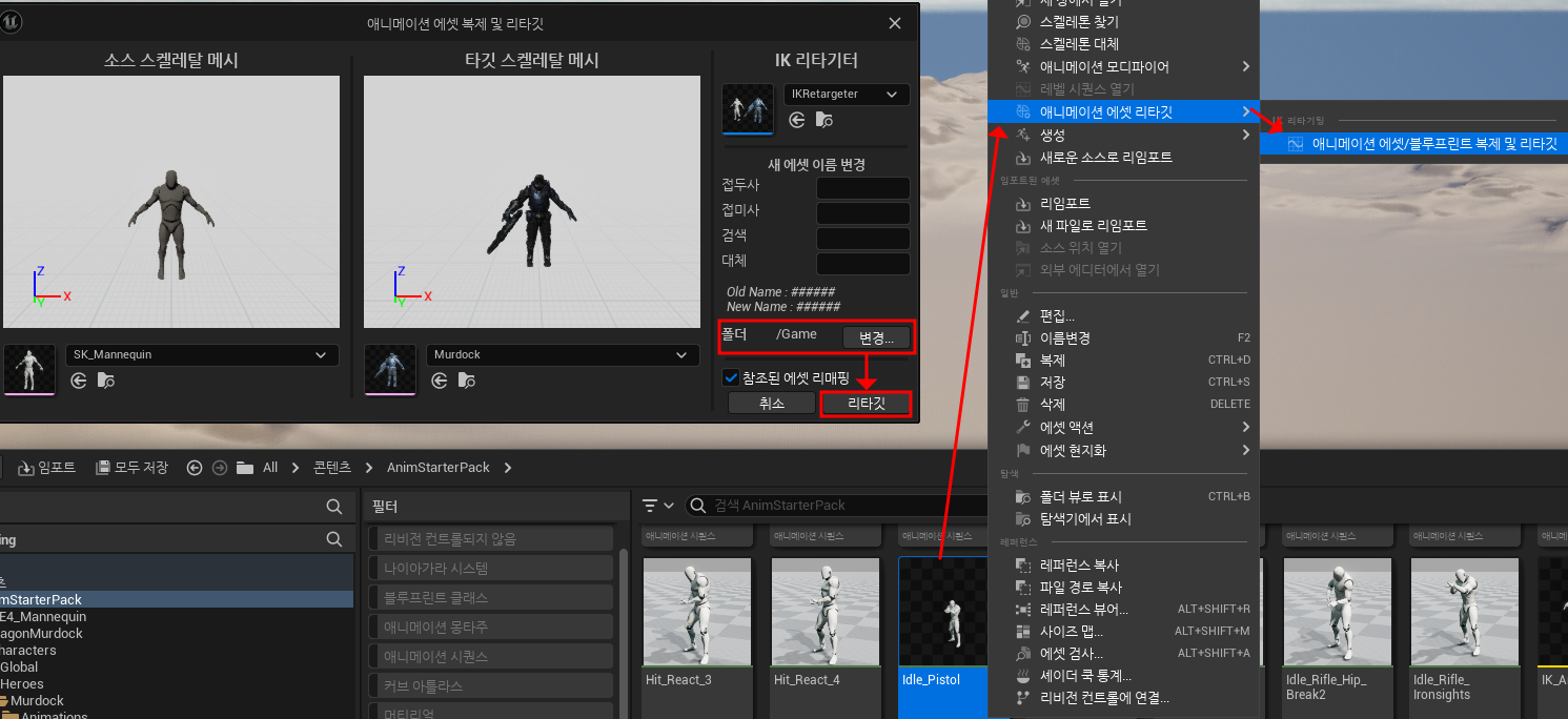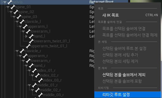 어셋 브라우저에서 원하는 애니메이션 어셋 우클릭 후, 아래와 같은 절차대로 리타깃 완료