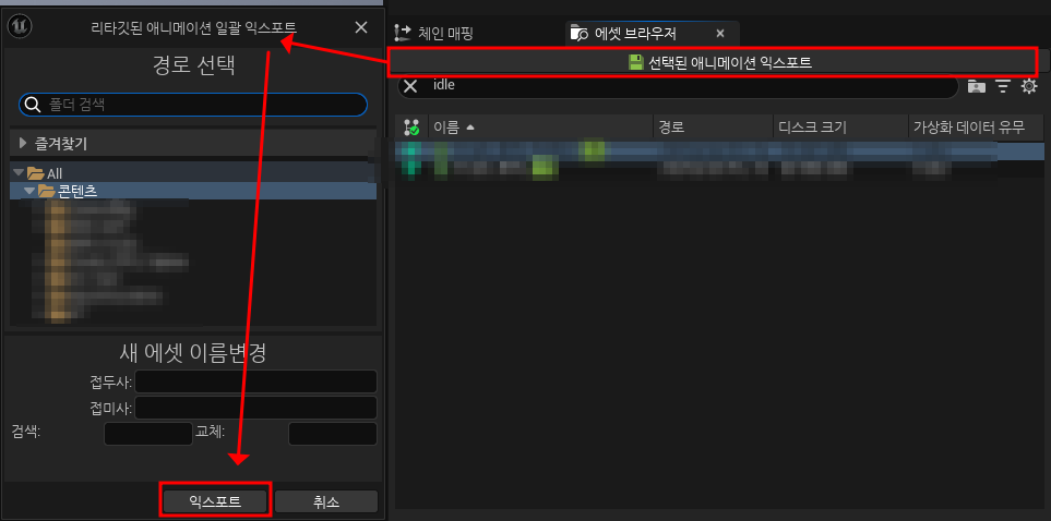 리타깃 창에서 변경 버튼을 눌러 원하는 경로를 설정하면 해당 경로에 애니메이션 적용된 어셋이 생성된다.