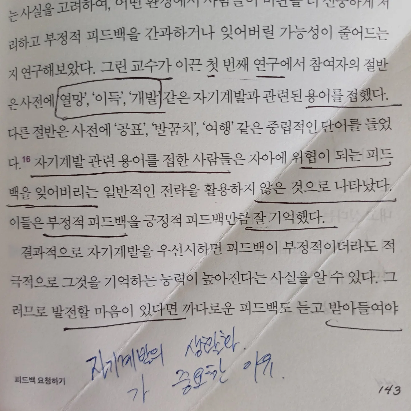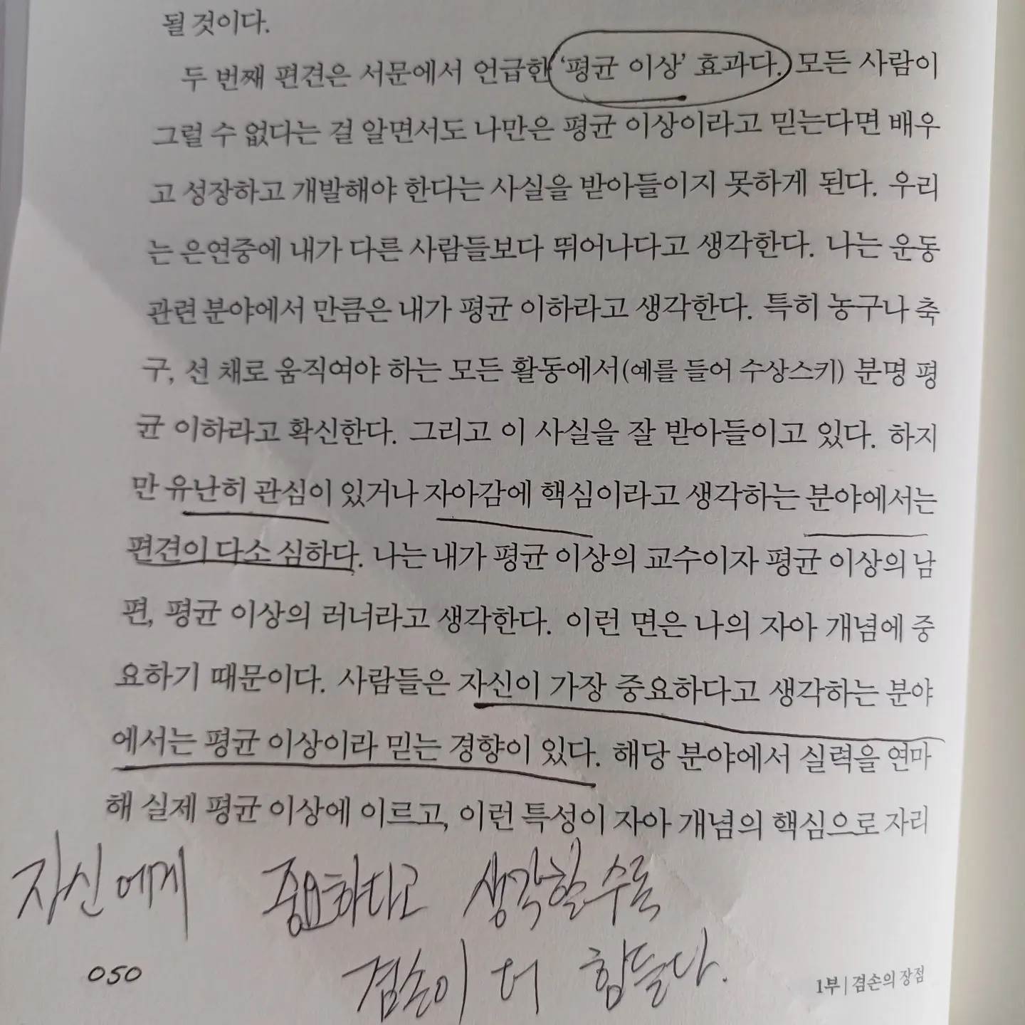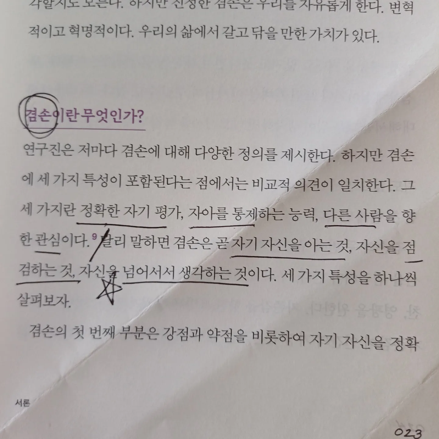 부족한지도 몰랐던, 진정한 겸손에 대해 알려준 책이다. 그간 겸손이란 혼자 이룬 것은 아무것도 없다는 것을 아는 것이라고 생각했다. 노력은 당연하고, 모든 일에는 타인의 도움, 환경과 운이 따르기 때문이다. 이는 '자신을 아는 것'에는 해당할지 모르겠으나, '자신을 넘어서서 생각하는 것'에는 해당하지 않는다.