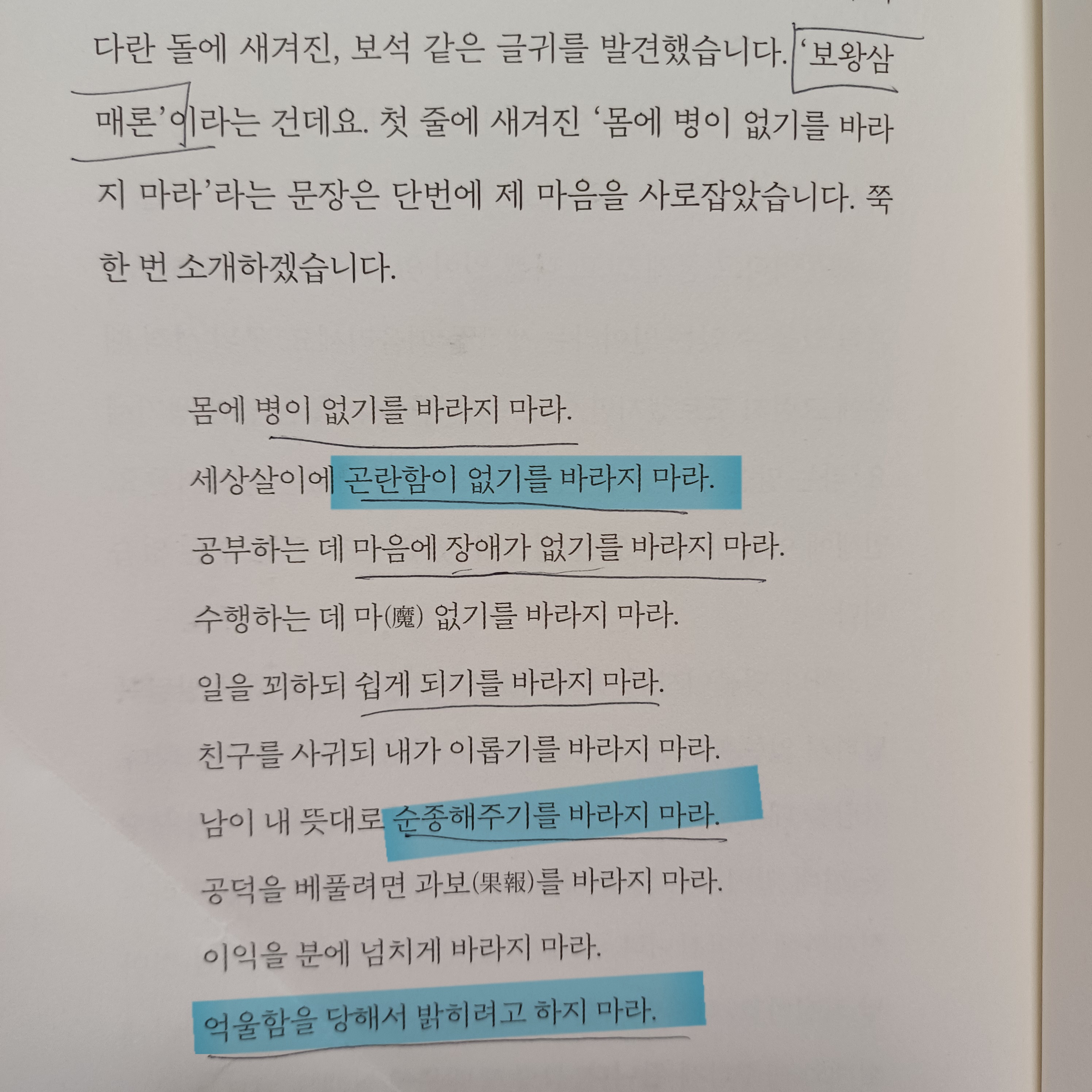 자존에 대해 쉽게 잘 설명한 책으로, '답은 그 자리에 있다. 아니면 없다.' 라는 말이 가장 와닿았다. 현재에 대한 존중을 실천할 수 있는 말이다.