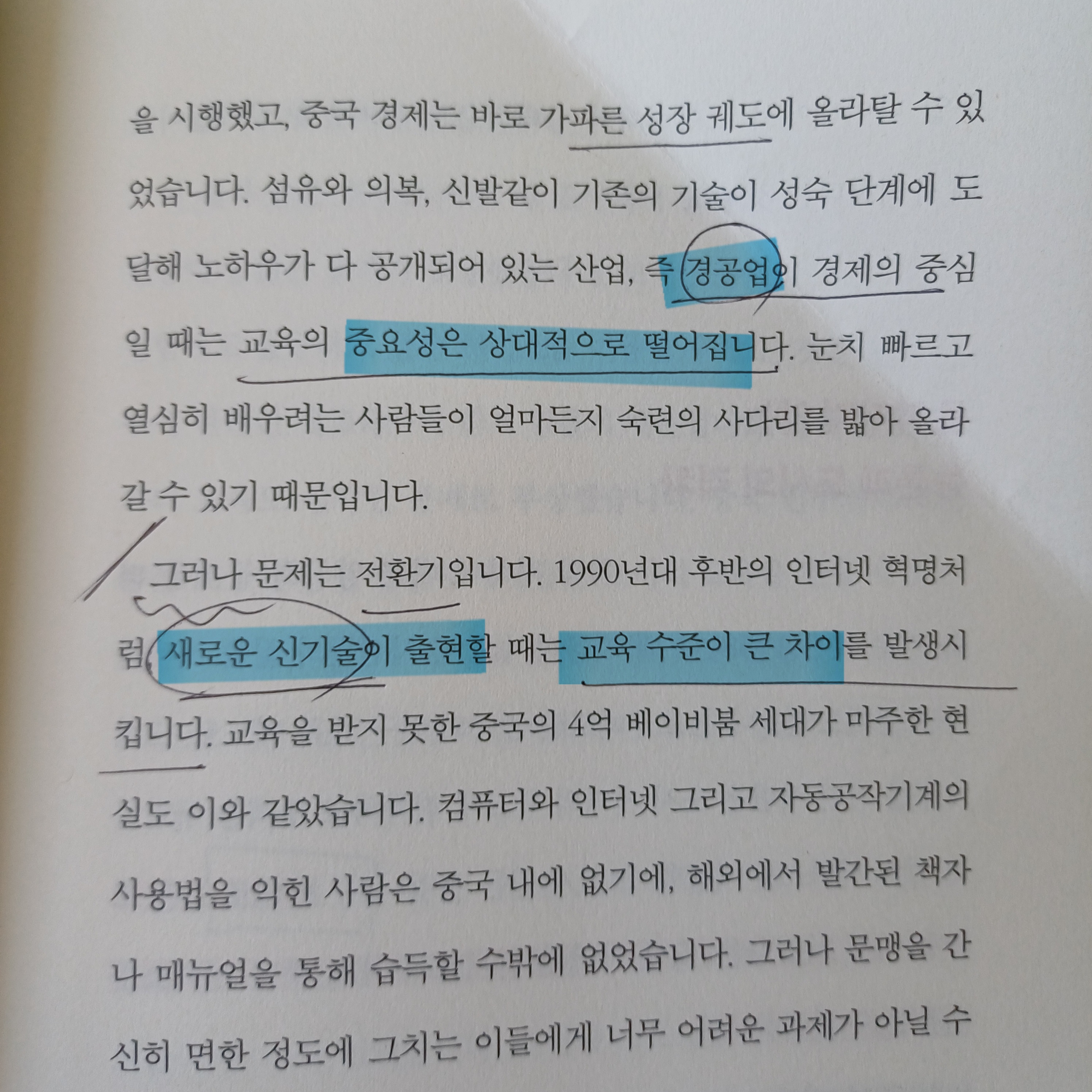경제에 있어 인적 자원의 중요성도 체감할 수 있었다. 경공업에는 미미하던 교육 수준의 차이가 신기술에는 큰 격차를 만든다는 것이다. 경제 전반에 얼마나 큰 영향을 미치는지 지표로 볼 수 있었고, 최근 독일(유럽)의 경제 쇠퇴도 이와같은 관점에서 해석하여 흥미롭다.