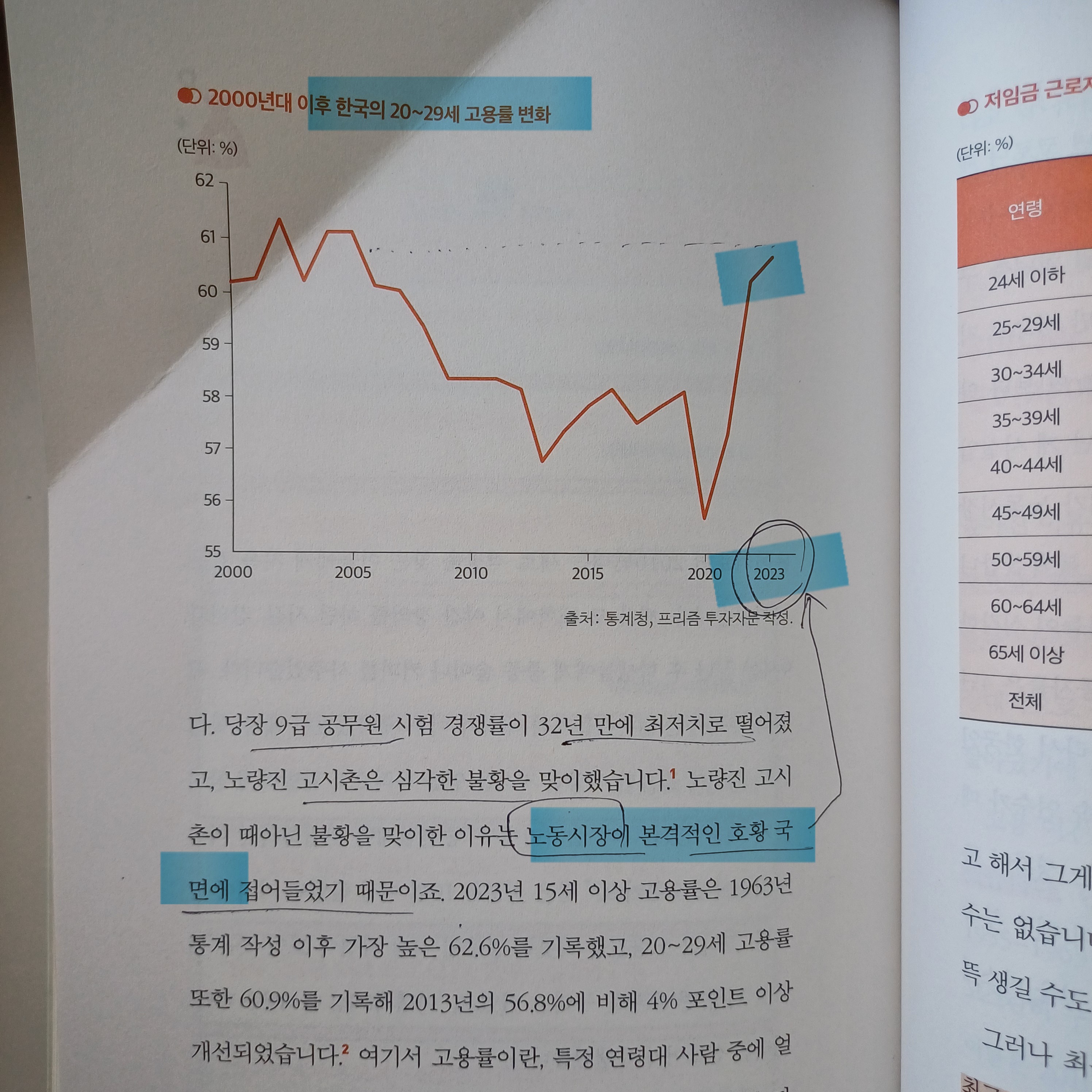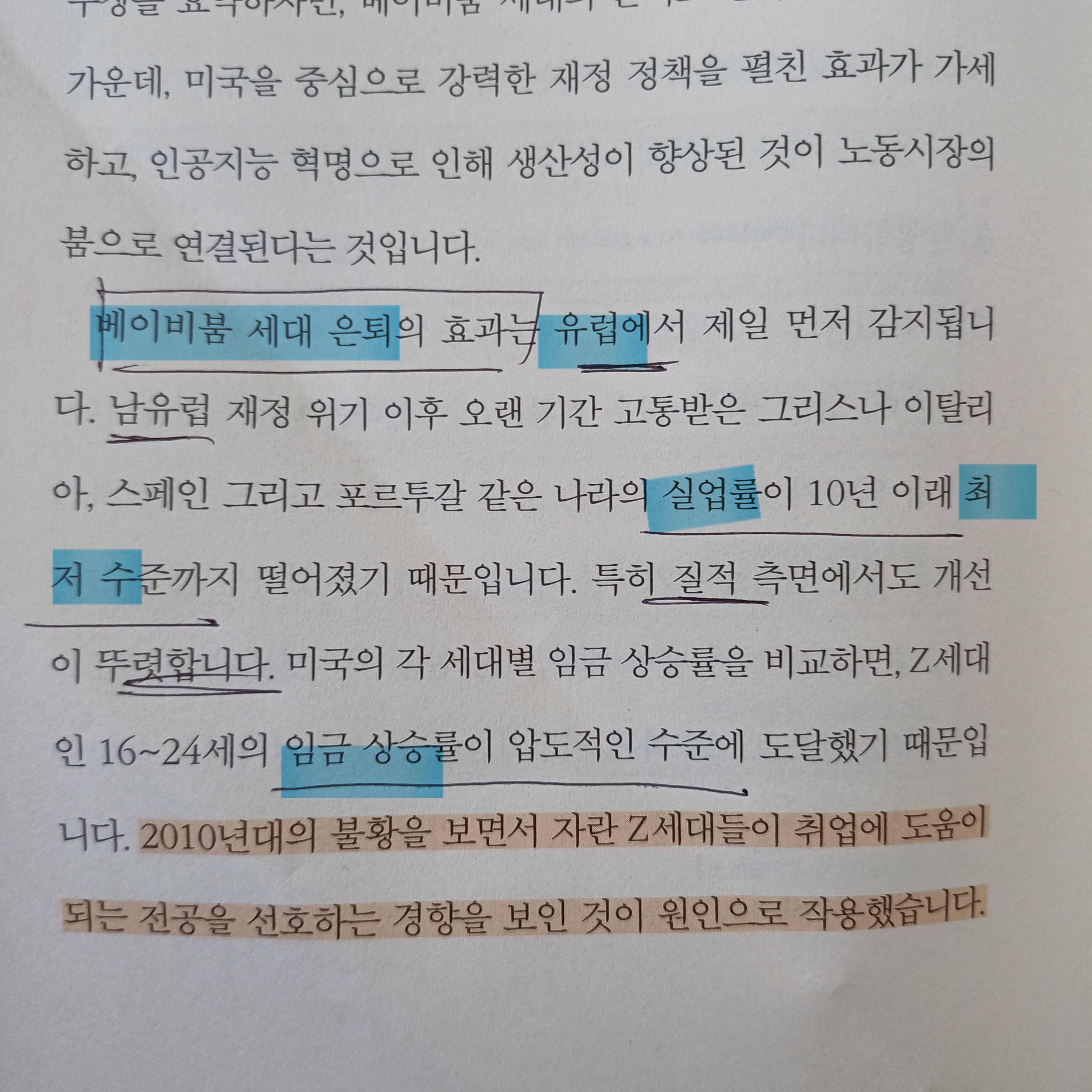 무엇보다 가장 인상 깊은 단락은 한국의 노동시장에 관한 내용이었다. 베이비붐 세대의 은퇴가 먼저 시작된 유럽 시장을 되짚어보며, 실업률은 떨어지고 임금상승률은 올라가는 전망을 내놓는다. 길고 긴 청년 세대의 취업 불황 시대가 끝나고, 노동시장 호황 국면에 들어섰다는 것이다.