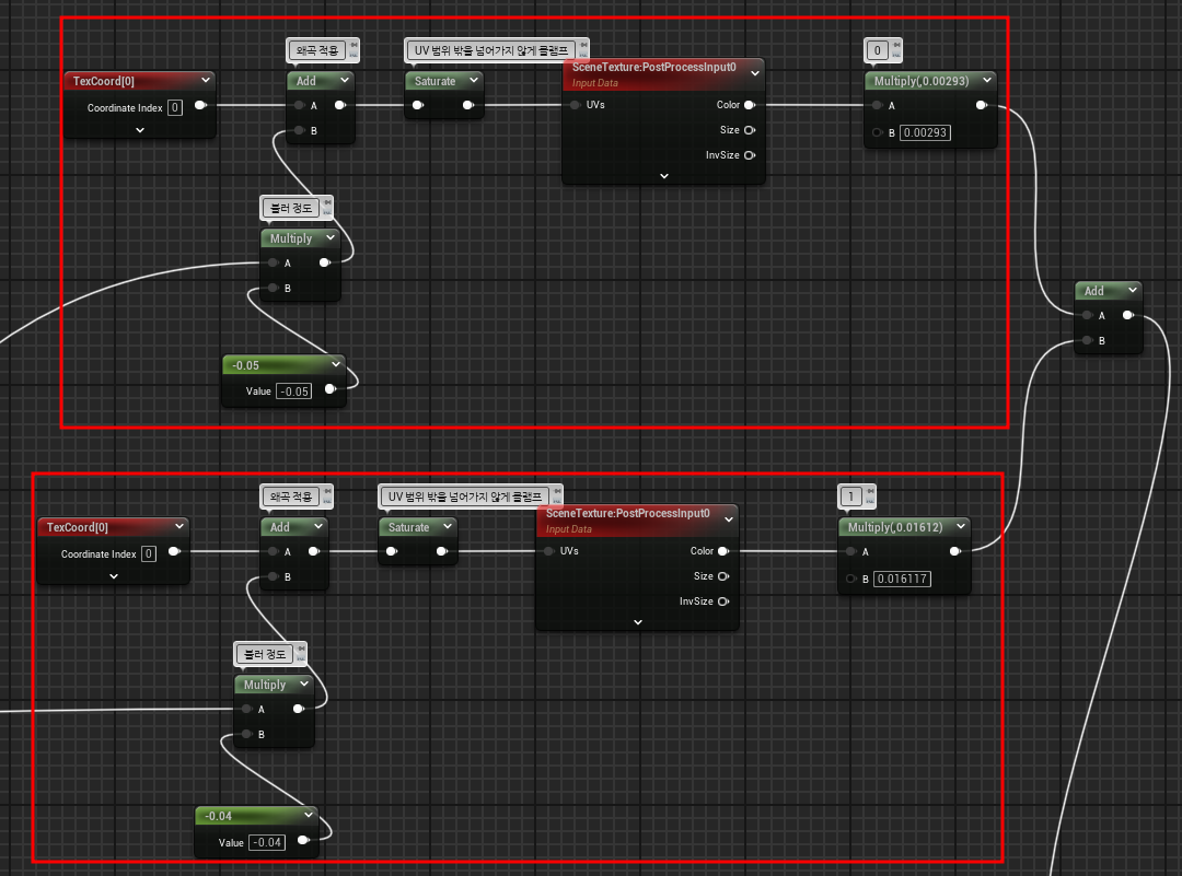 Vector2(0.5, 0.5)로 화면 중앙을 설정한다. - 벡터 생성: 현재 픽셀 위치에서 중앙 좌표를 빼서 벡터를 만든다.