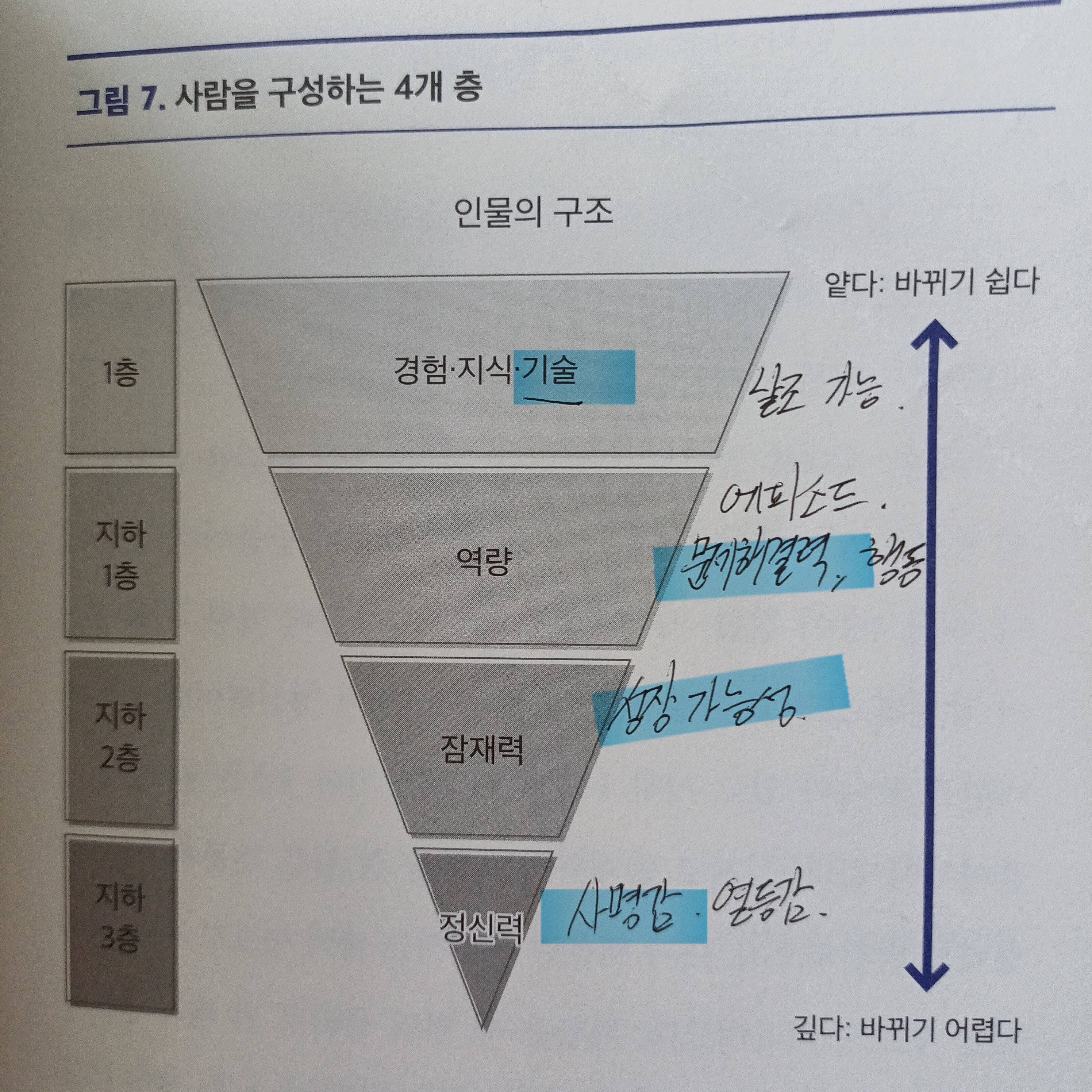 또한 인재의 능력을 단순 기술과 지식으로 판단하지 않으며 심층적으로 해석해나가는 것이 흥미로웠다. 사명감, 잠재력(성장가능성), 역량(문제해결력), 기술과 지식 순으로 인간의 능력이 발현한다는 것이다. 껍데기에 불과한 기술과 지식 너머를 보는 것이 면접의 역할이라는 것이다.