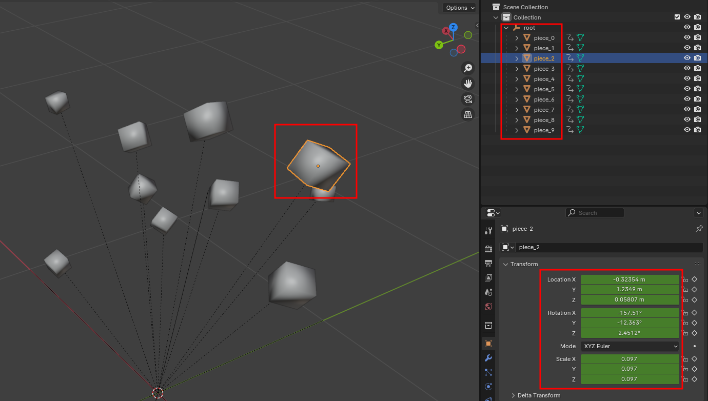 각 조각별로 모두 분리돼있어야하며, Transform 정보가 들어가있어야할 때가 있다.