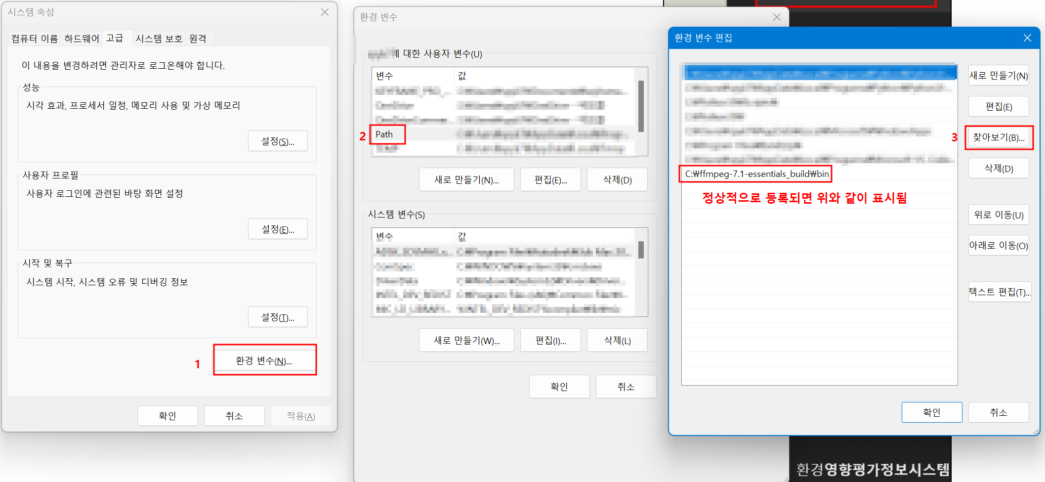 3. 아래 그림과 같이, 환경 변수 - 사용자 변수 Path에서 ffmpeg 폴더의 bin 경로 추가