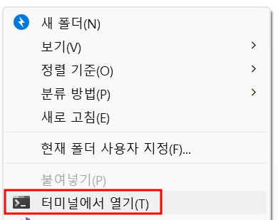 1. 설치할 폴더에서 우클릭해서 아래 그림과 같이 '터미널에서 열기' 선택