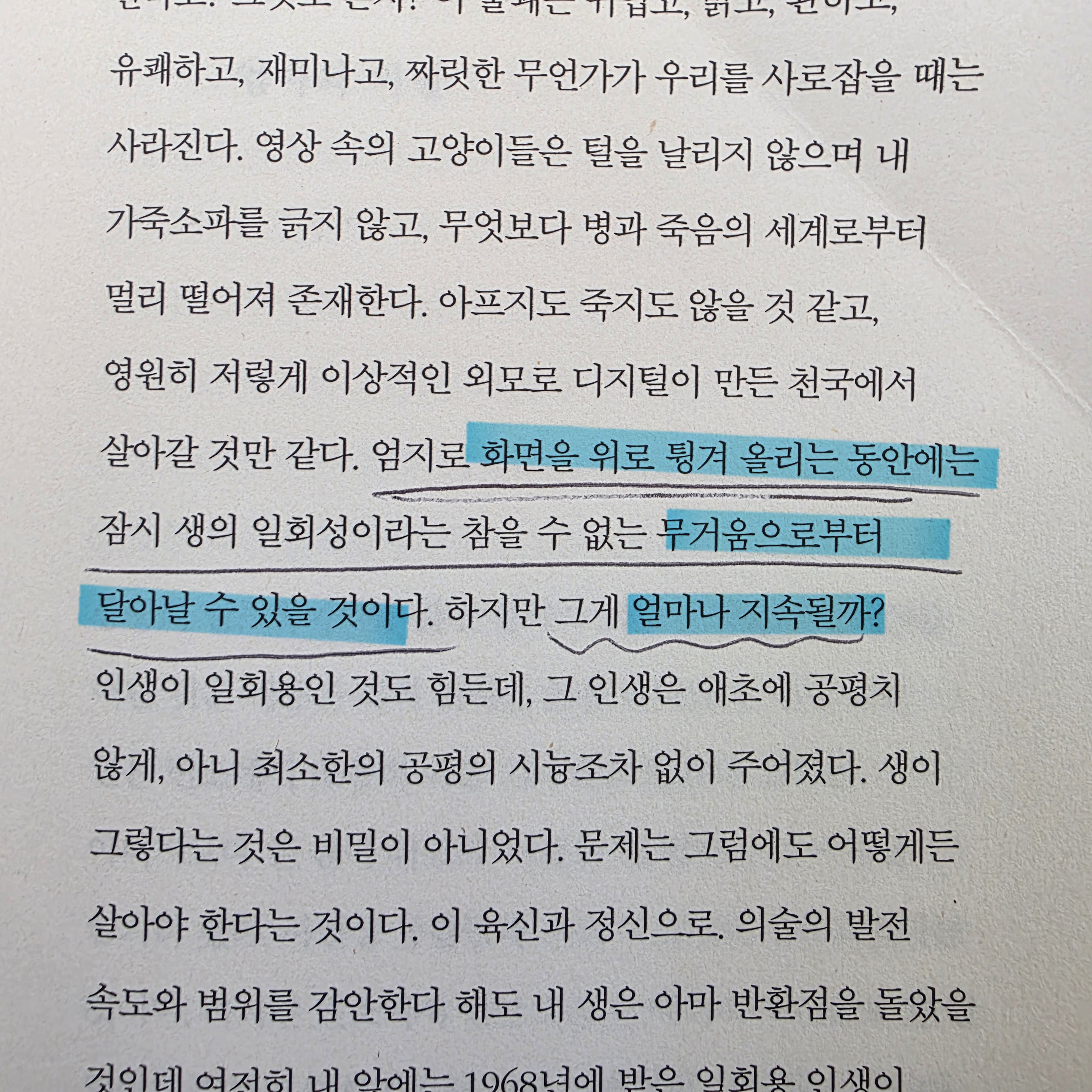 저자도 이야기한다. 존재의 참을 수 없는 가벼움에 대해서. 그래서 더욱 즐길 수 있는 것이 아닐까? 내가 세상에 엄청난 존재가 아니기 때문에, 그래서 순수히 과정에 더 집중할 수 있는 자격이 있는 것이다.