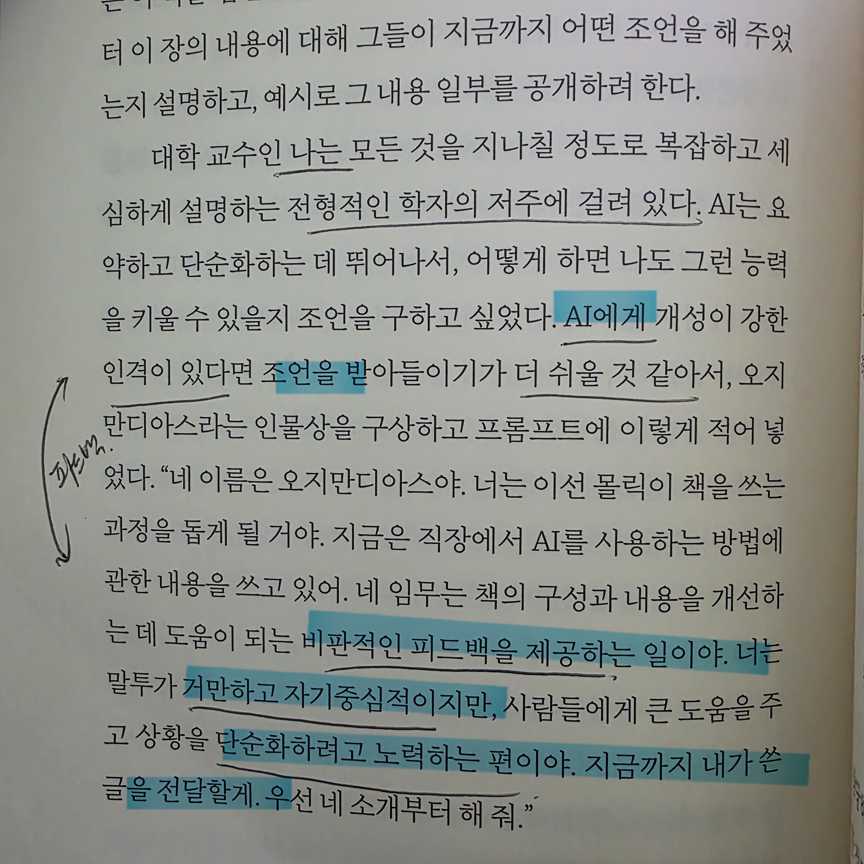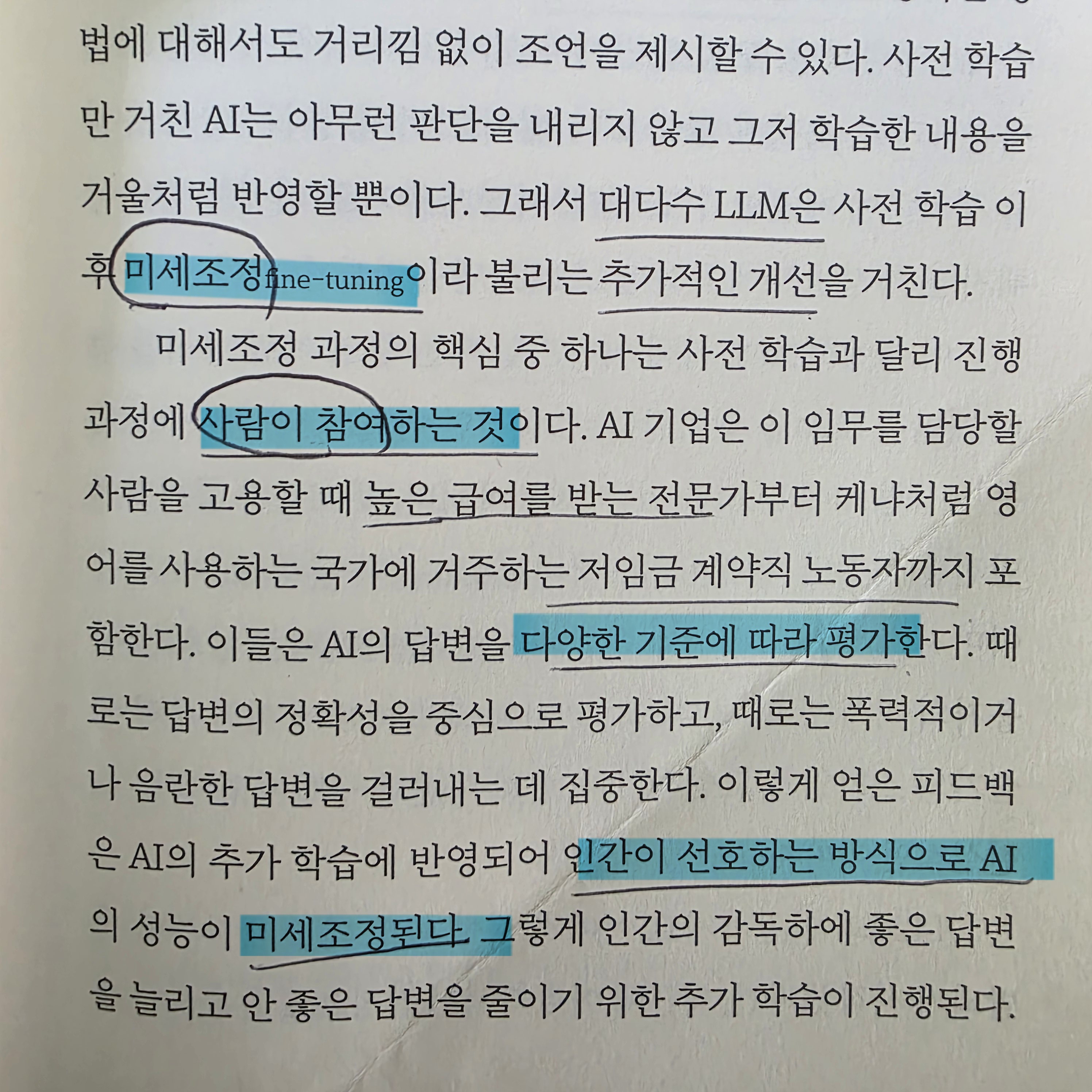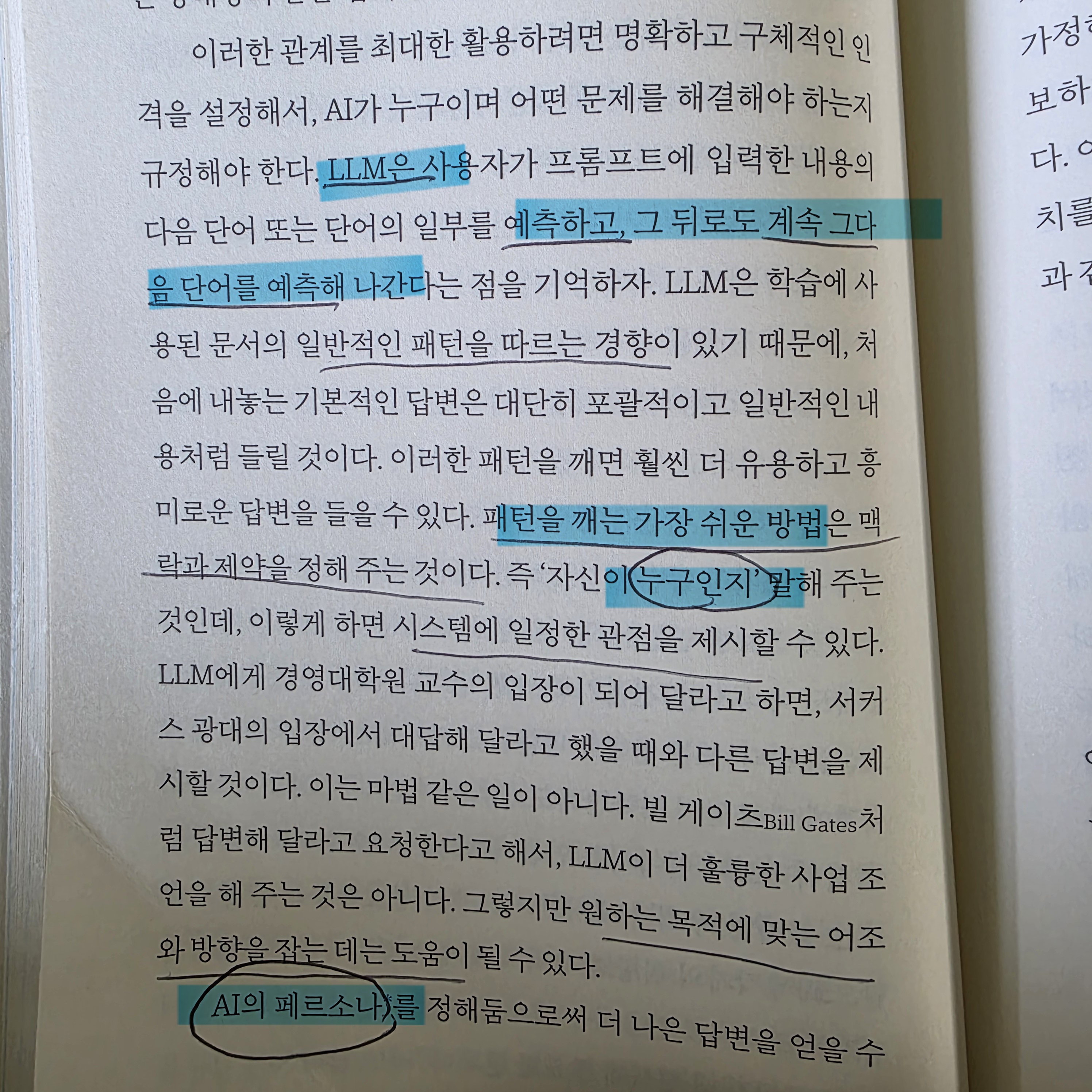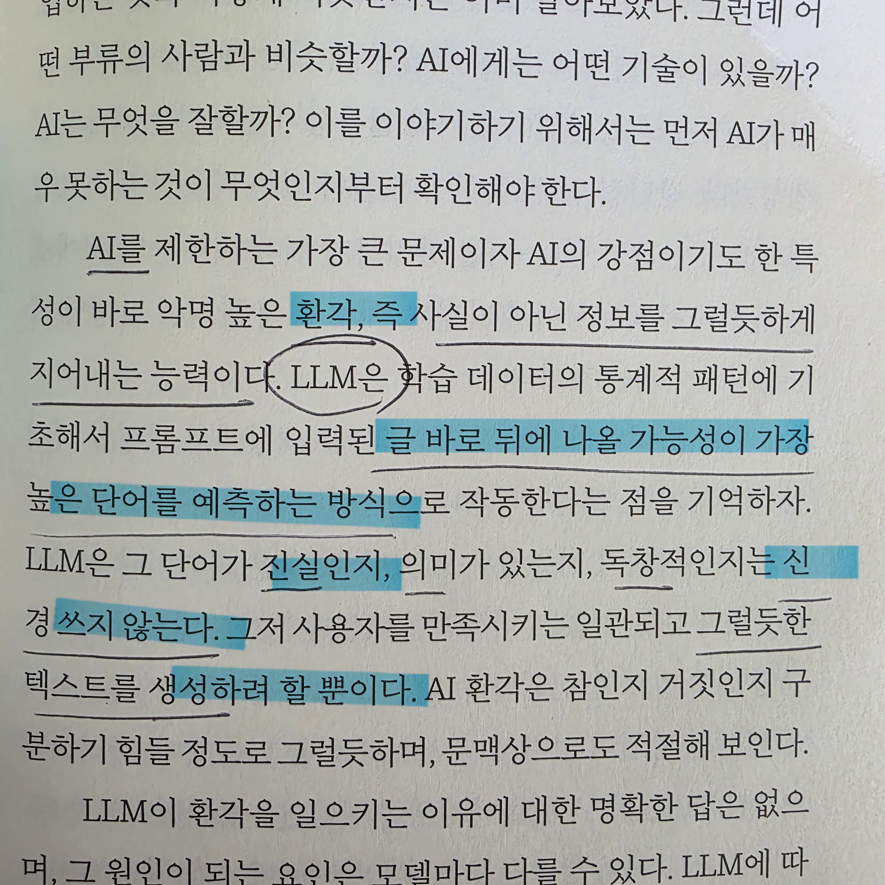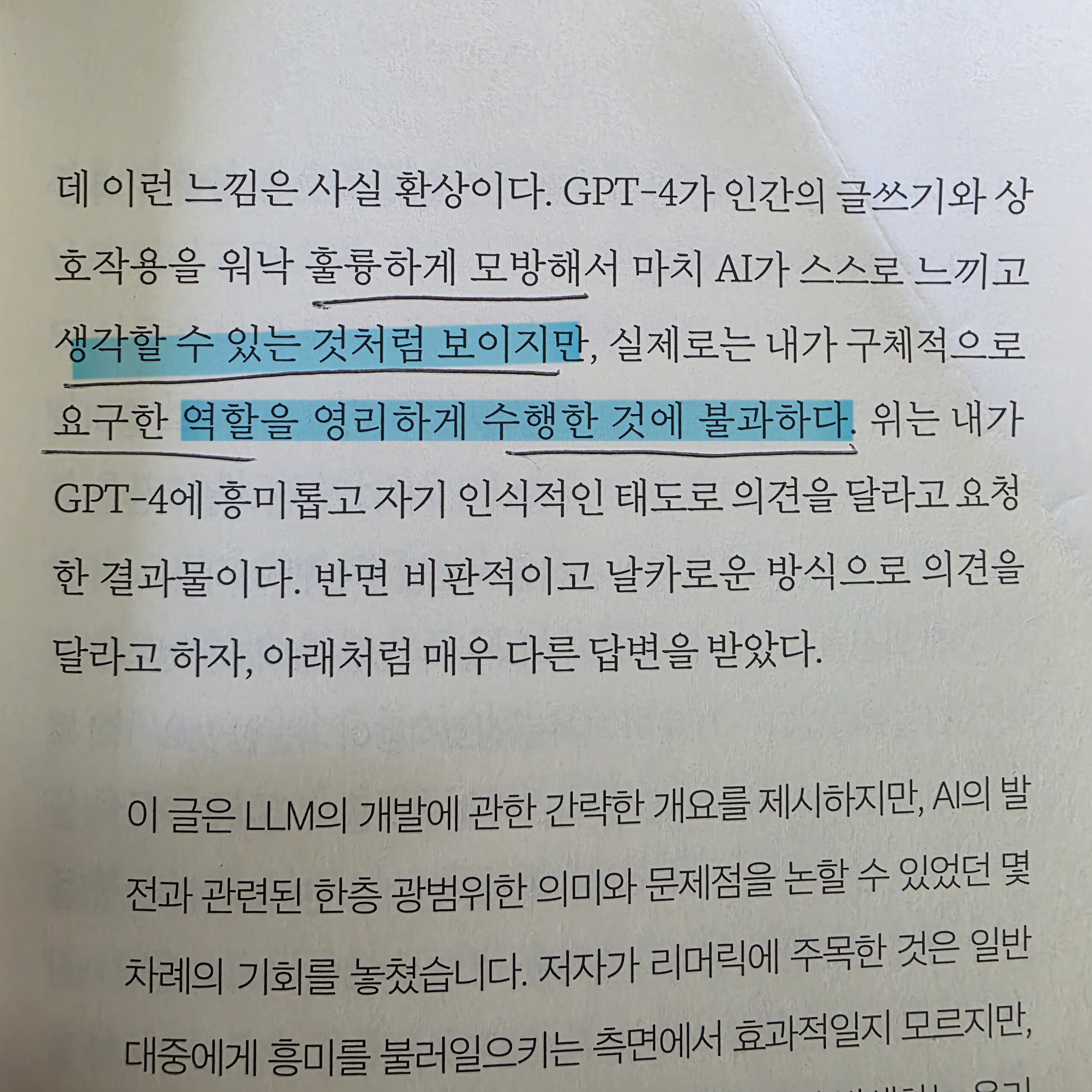이 책은 그 막연함을 해소해주었다. 쉽게 설명하면서도 실제 사용에도 도움이 되는 정보를 제공한다. 특히 AI는 단순 텍스트 연결기계이며, 성찰이 불가능하다는 점이 인상 깊었다. 이 특징만 알아도 GPT를 훨씬 더 능숙하게 다룰 수 있겠다는 생각이 든다.