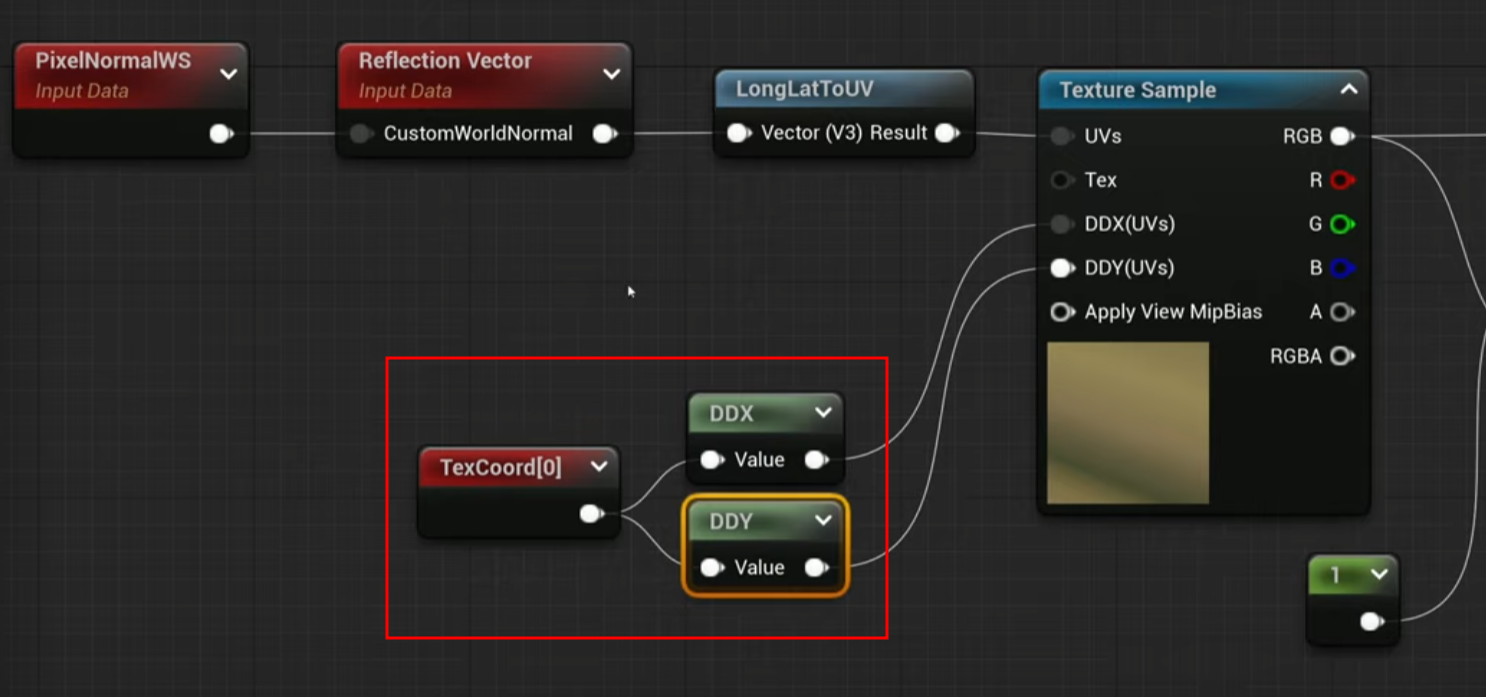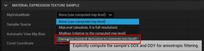 1. Texture Sample 노드에서 Mip Value Mode를 설정