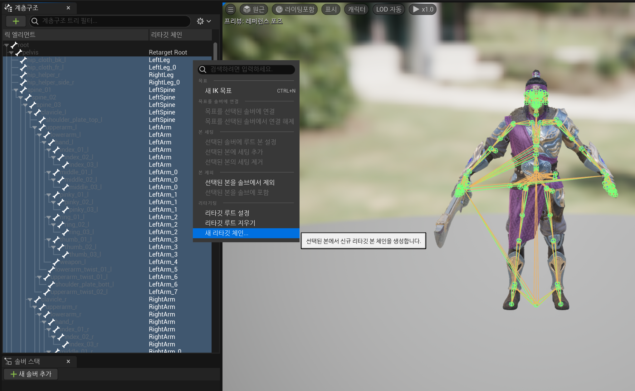 2. root와 pelvis를 제외한 모든 본들을 선택한 후, 새 리타깃 체인을 적용한다.