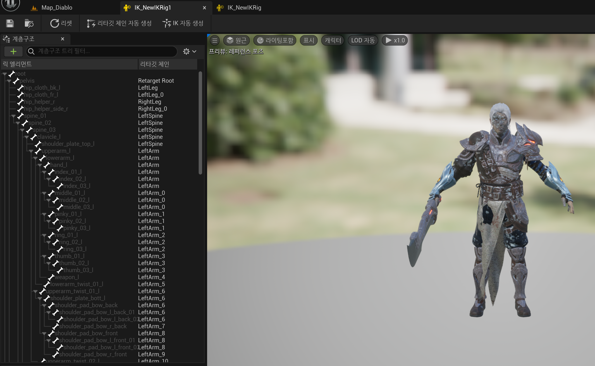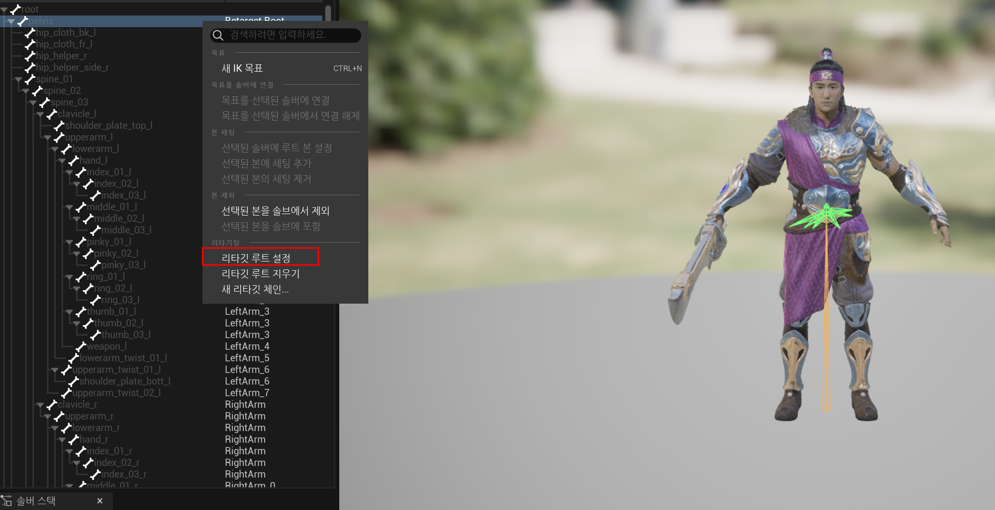 1. IK릭을 열고, 리타깃 루트 설정을 pevlis로 한다.
