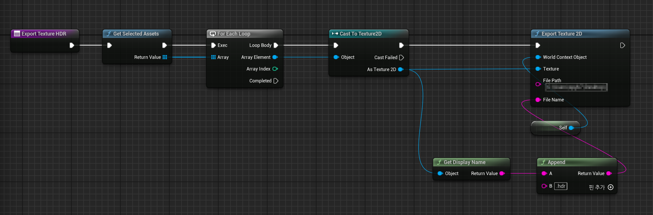 위 블루프린트에서 Export Texture 2D에 self를 넣어준 이유