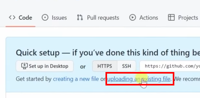 - 생성된 레포지토리 페이지에서 'uploading an existing file' 옵션을 선택한 후, 로컬 컴퓨터에 있는 파일을 웹페이지로 드래그 앤 드롭하여 업로드