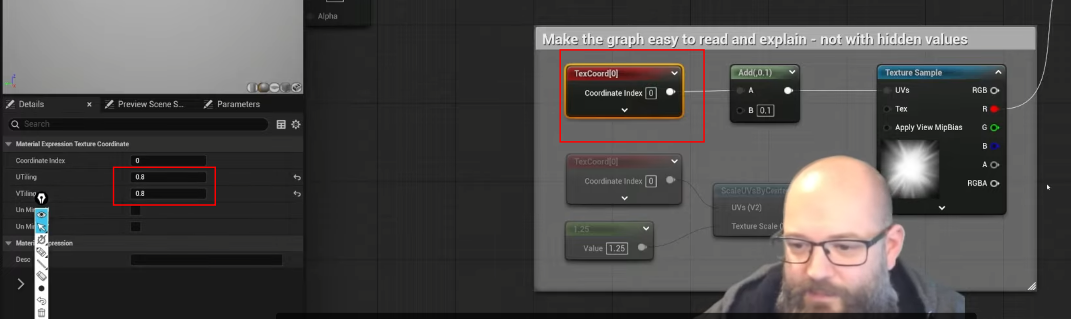 - '블랙 박스' 피하기: 노드 내부의 기본값을 수정하는 것을 피해야 합니다. 예를 들어, TextureCoordinate 노드 내부의 UV Tiling 값을 0.8로 수정하면 [24:49, 24:52], 그래프 외부에서는 이 정보가 숨겨져(hidden) 파악하기 어렵습니다.