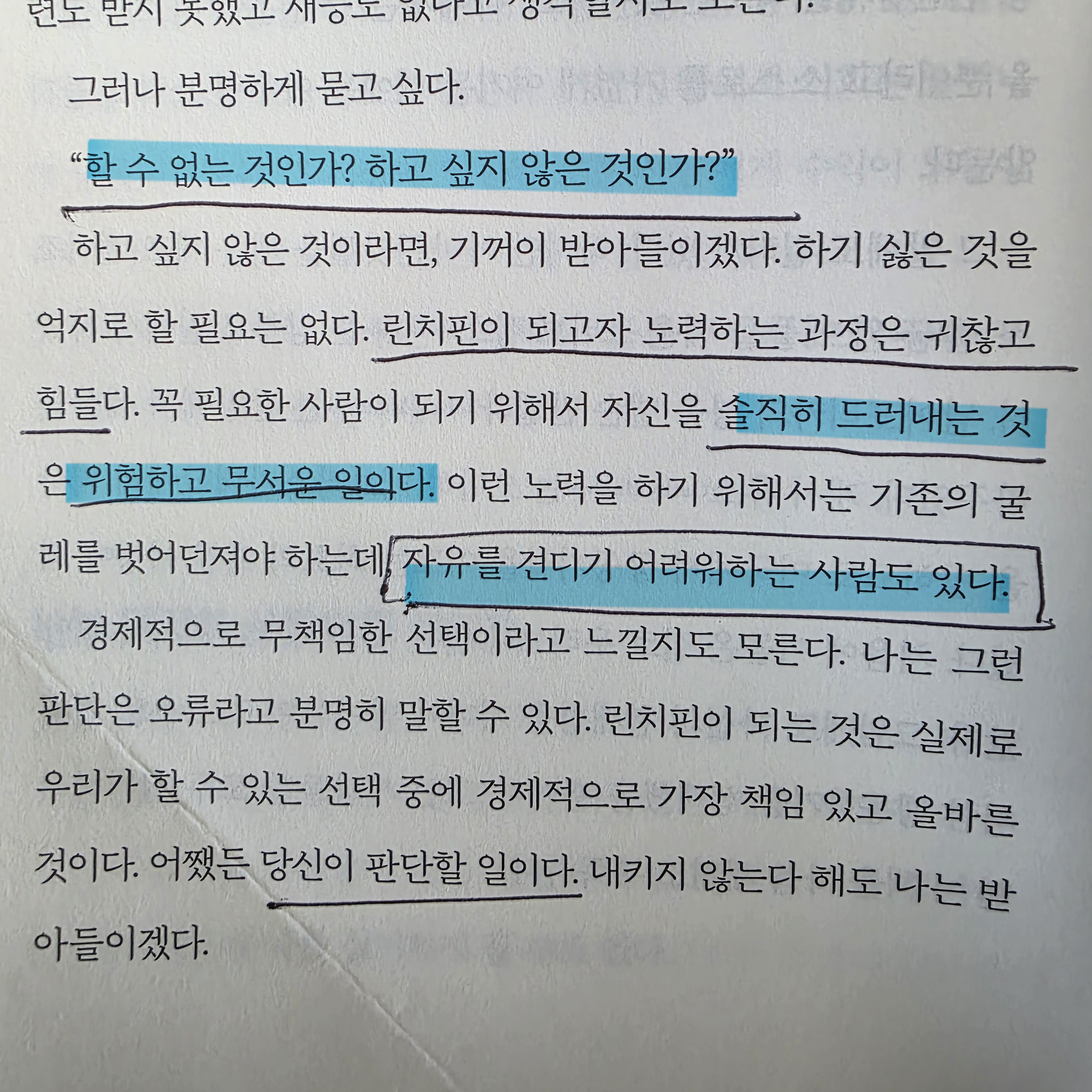 경쟁력 있는 사람, 린치핀이 되려면 감내해야할 대가에 대해 알려주는 책이다. 누구나 부품처럼 사는 것은 거부하지만 그에 따른 책임을 져야할때는 마다한다.