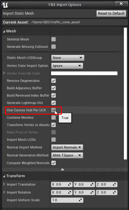 - One Convex Hull Per UCX (해제): 이 옵션 또한 체크 해제해야 합니다. 이 옵션이 켜져 있으면, 여러 조각으로 나뉘어 있는 충돌체들을 언리얼이 강제로 하나의 덩어리로 뭉쳐버릴 수 있습니다. 후디니에서 Convex Hull로 분리해둔 디테일을 살리기 위해서는 이 옵션을 꺼야 각각의 조각(Hulls)이 분해된 상태(Decomposed)로 올바르게 임포트됩니다.
