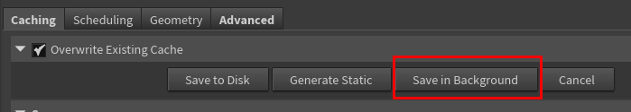 - Save to Disk in Background: 이 버튼을 클릭하면 후디니의 메인 뷰포트가 멈추지 않습니다. 대신 별도의 'Task Graph' 창이나 하단의 진행 상태바를 통해 백그라운드에서 지오메트리가 저장되는 과정을 모니터링할 수 있습니다.