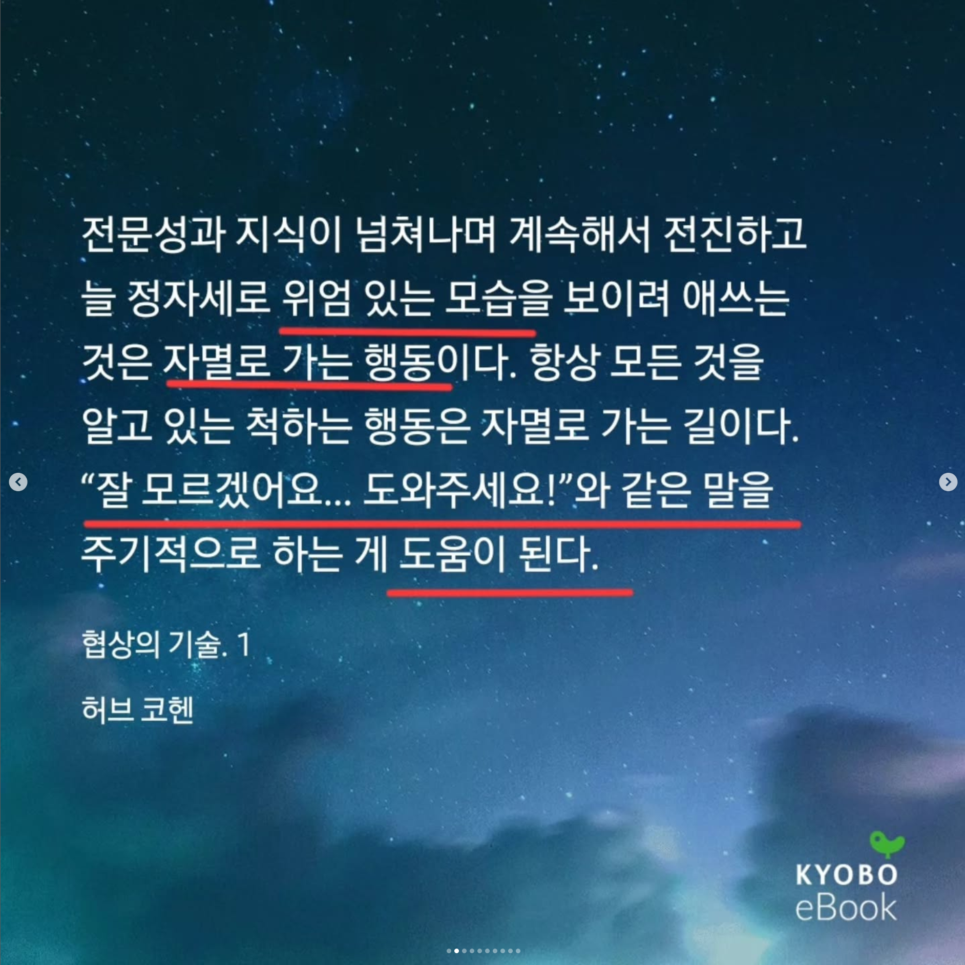 인간적인 면을 내보이고 때로는 솔직하게 단점을 얘기하며 도움을 부탁하는 것이 오히려 유리하다는 점이 인상 깊었다.