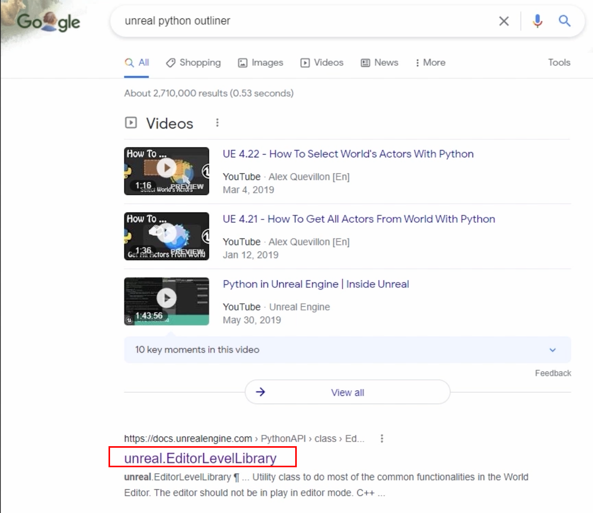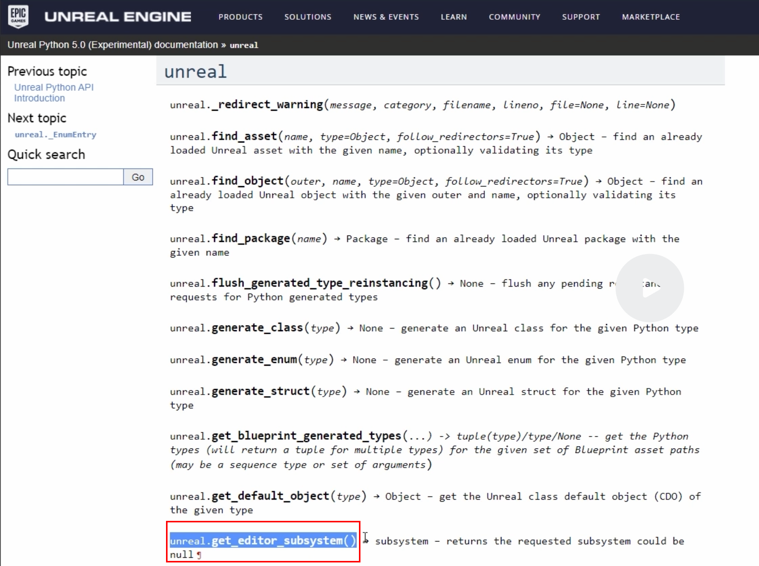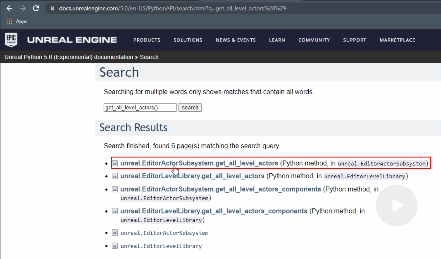 unreal python api 문서로 가서 메서드 이름을 검색하면
